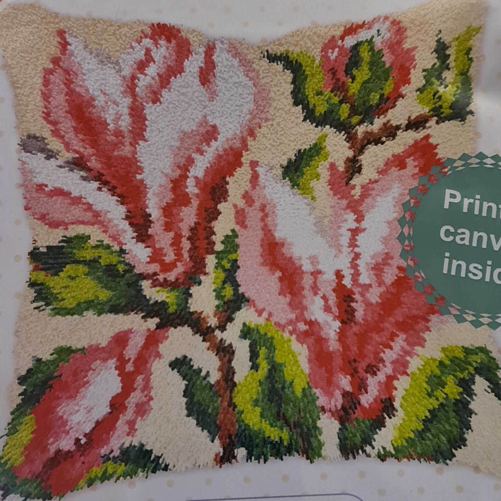 Knoopkussen van een magnoliatak met magnoliabloemen inclusief voorbedrukt stramien, voorgesneden acrylwol, knoophaak en instructie
