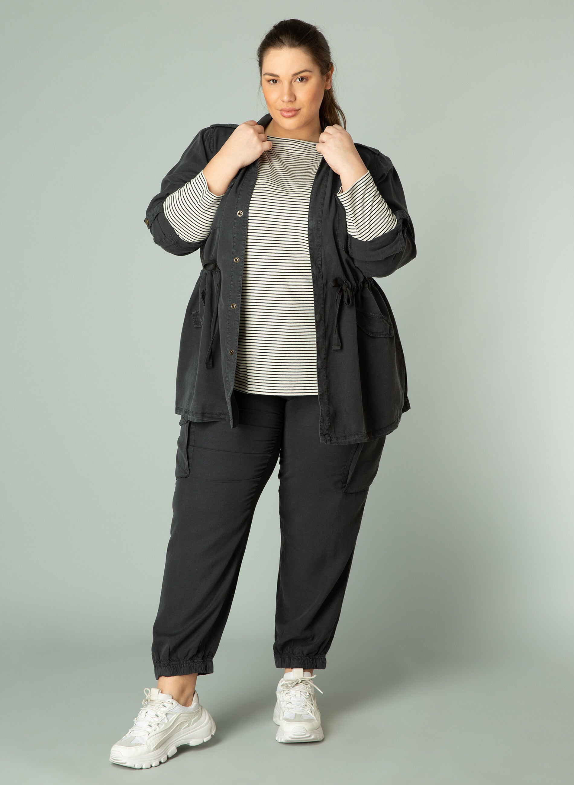 Jasje van Tencel in een washed black uitvoering. Diverse details zoals de blinde sluiting, een tunnel met koord om te tailleren en epauletten op de schouders.