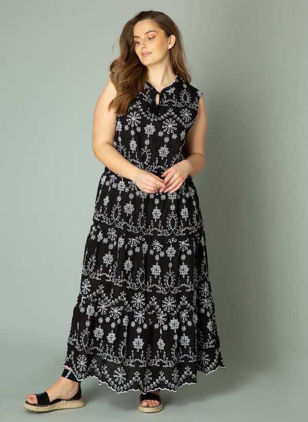 Mouwloze jurk met borduursels in een enkellang model. Deze maxijurk waaiert wijd uit, mede door de extra roezels. De ronde hals heeft een roezeltje en kan gestrikt worden. Voorzien van een extra onderjurkje, deze komt tot boven de knie.