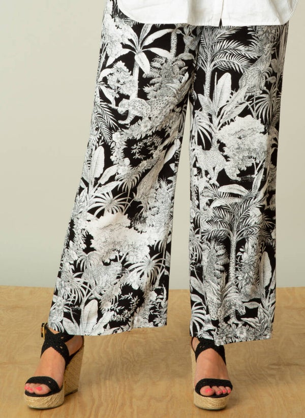Pantalon in een recht model met een zwart witte jungle print. Deze broek heeft een sluiting met ritsen een haakje. De tailleband heeft riemlusjes en van achteren elastiek. Kleine steekzakjes in de zijnaad.