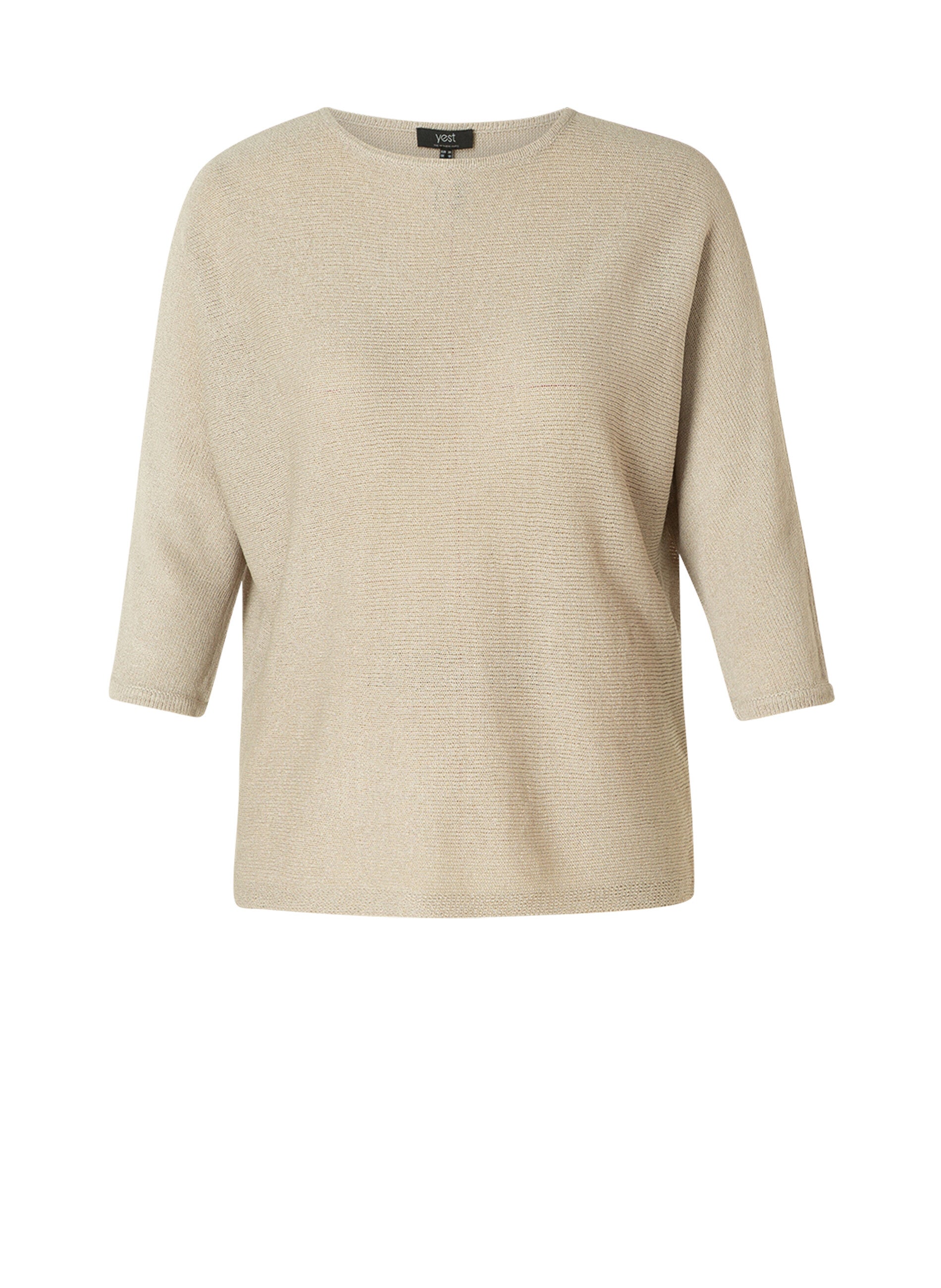 Zomers truitje in een dun breisel met driekwart aangeknipte mouwen. In een beige kleur. Dit model heeft een boothals en een loose-fit.