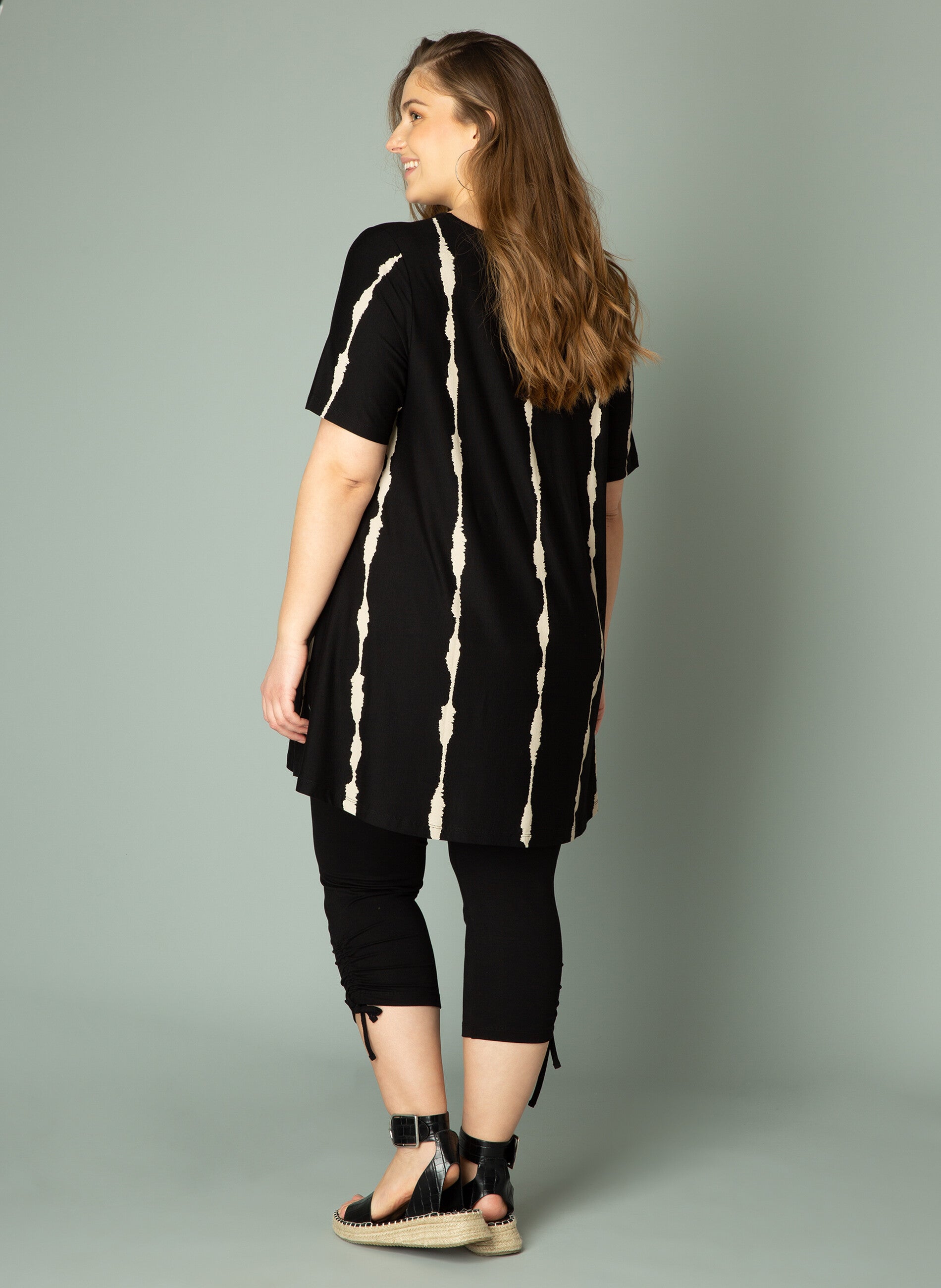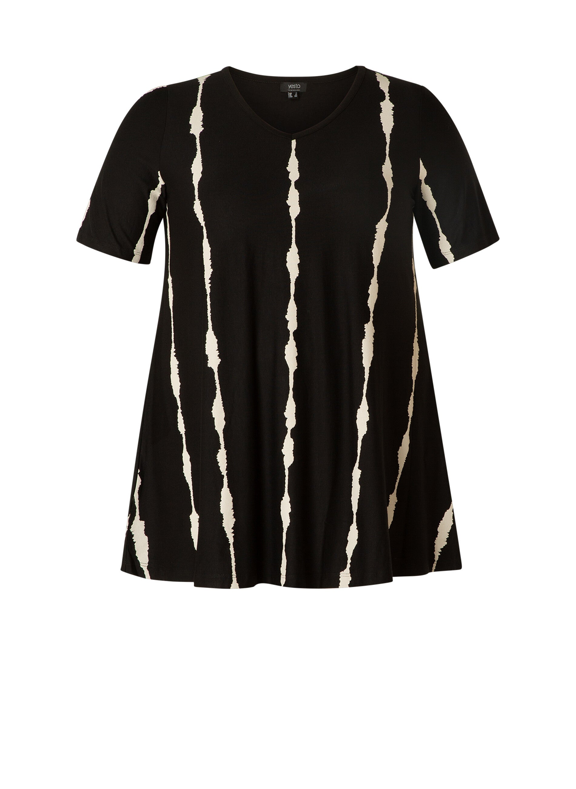 Tuniek in een A-lijn. Tuniek is in een heuplang model. Korte mouwen en een kleine V-hals. Kleur zwart/ beige